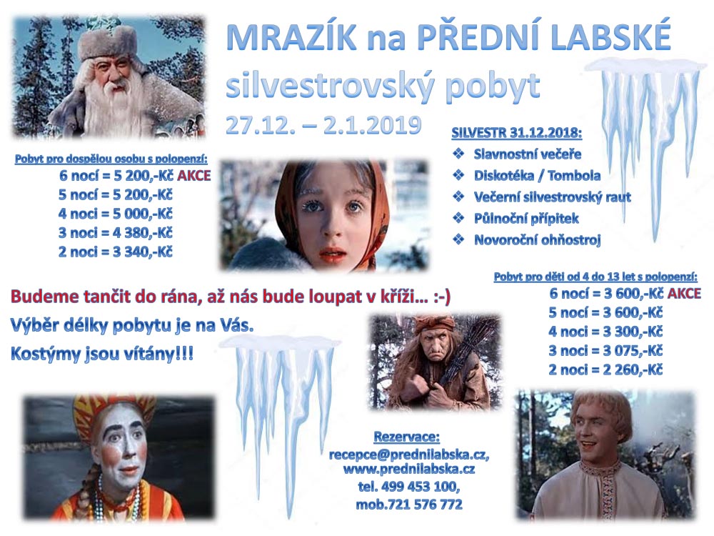Vymýšlet akce a zábavu pro Vás, nás hrozně baví, předháníme se a losujeme, který nápad letos „půjde do světa“. Letošní silvestrovský pobyt bude …… MRAZÍK …… kdybych Vám měla popisovat, jak jsme se k tomu dopracovali, tak by Vám asi utekla půlka pracovní doby při čtení, ale byla to vážně legrace. :-) A tak to má být.