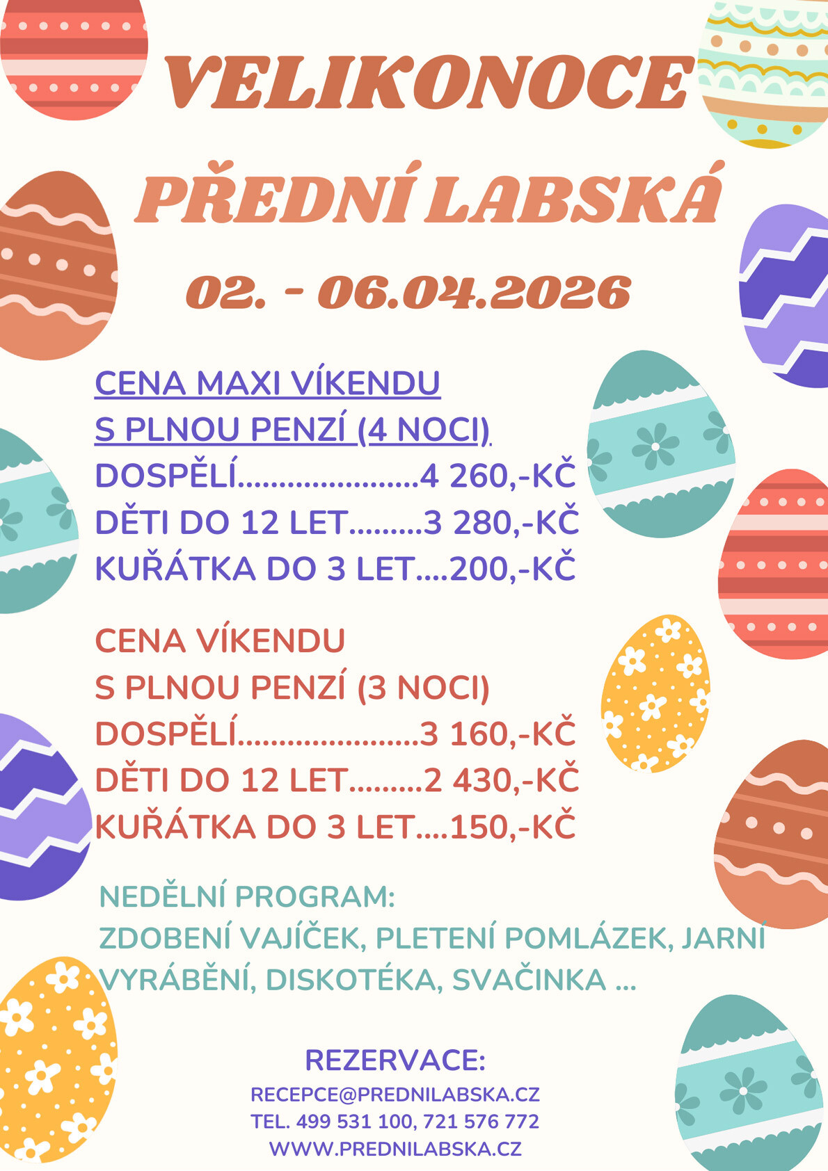 Srdečně vás všechny zveme na prodloužený či dokonce maxi prodloužený víkend na Přední Labskou, s nedělním programem nejen pro děti – zdobení perníčků a vajíček, pletení pomlázek, hravou diskotéku…